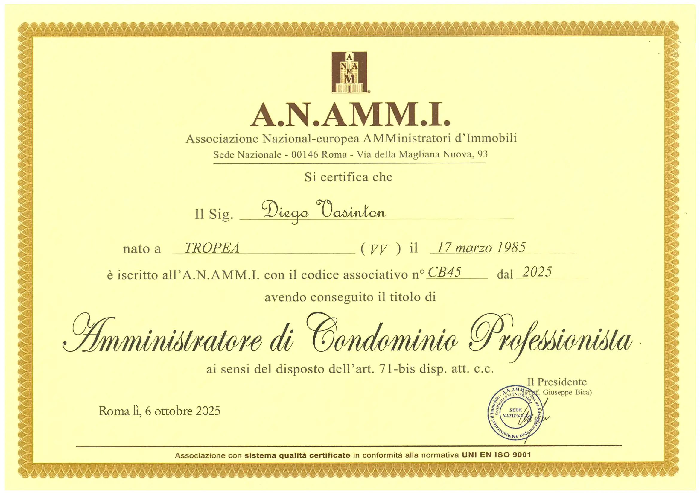 Diego Vasinton: Attestato di Amministratore di Condominio A.N.AMMI.