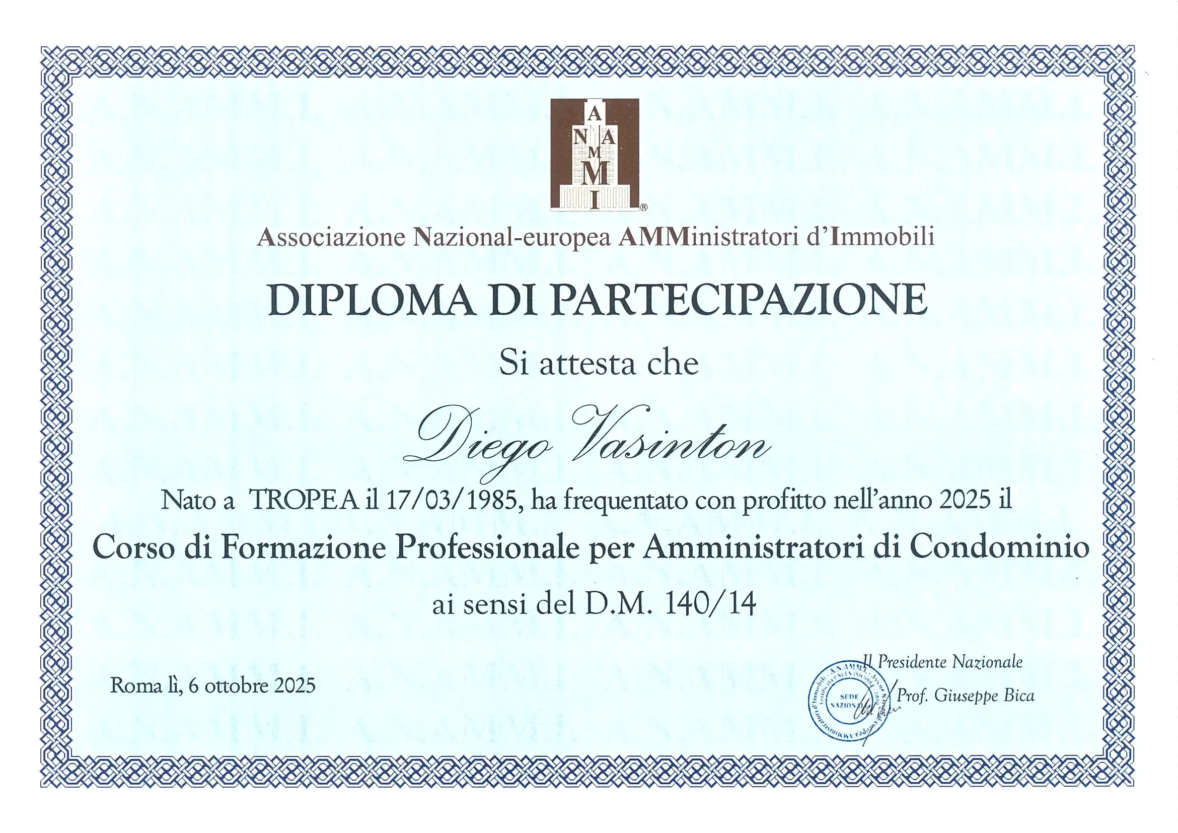Diego Vasinton: Attestato di Aggiornamento per Amministratore di Condominio A.N.AMMI.