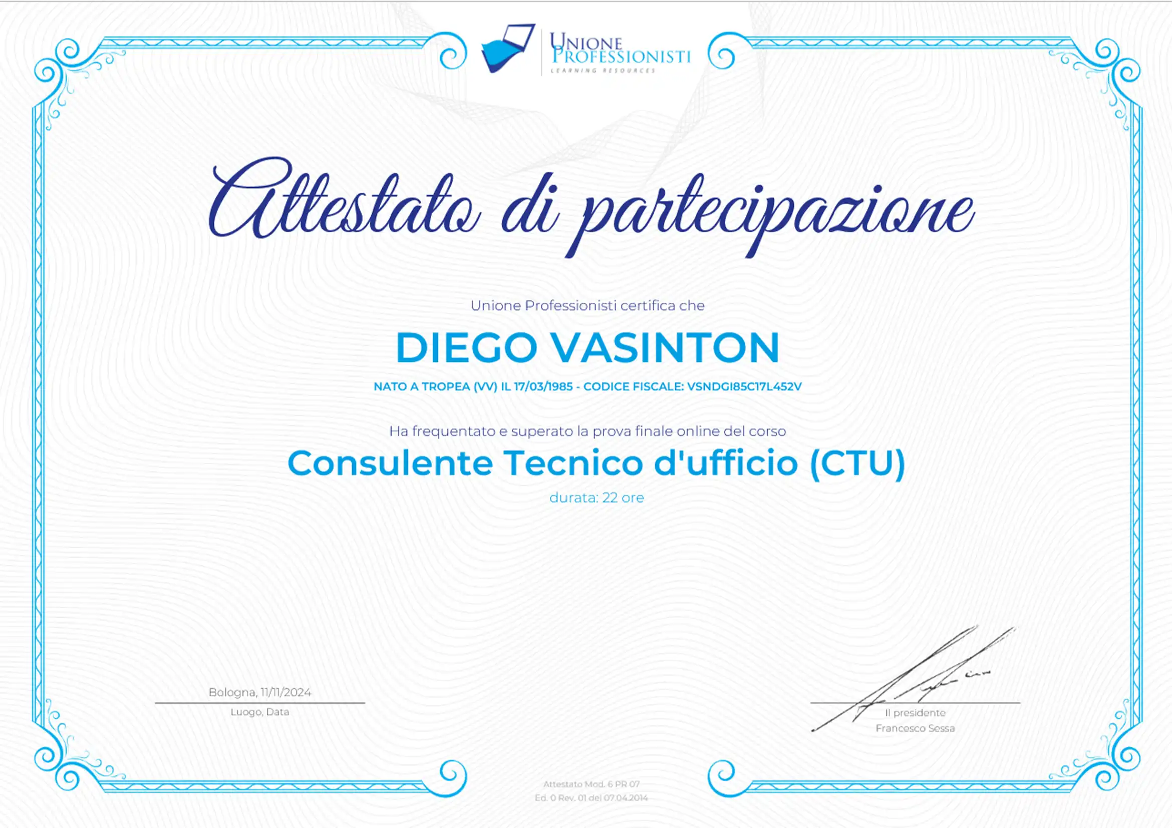 Diego Vasinton: Attestato C.T.U. Consulente Tecnico d'Ufficio