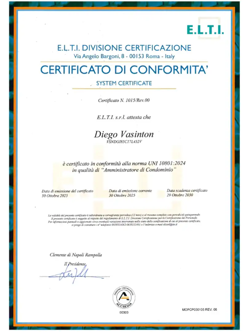 L’Amministratore Diego Vasinton è in possesso di Attestato di Qualifica Professionale, come disposto dalla legge n. 4 del 14 gennaio 2013 e di tutti i requisiti richiesti dall’art. 71 bis delle disposizioni per l'attuazione del Codice civile, così come introdotto dalla Legge n. 220 del 11 dicembre 2012.