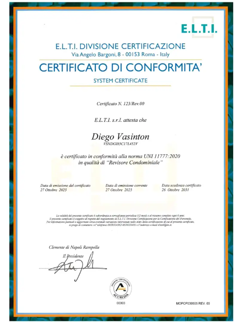 Diego Vasinton: Attestato di Formazione Iniziale in Materia di Revisione Condominiale 2025